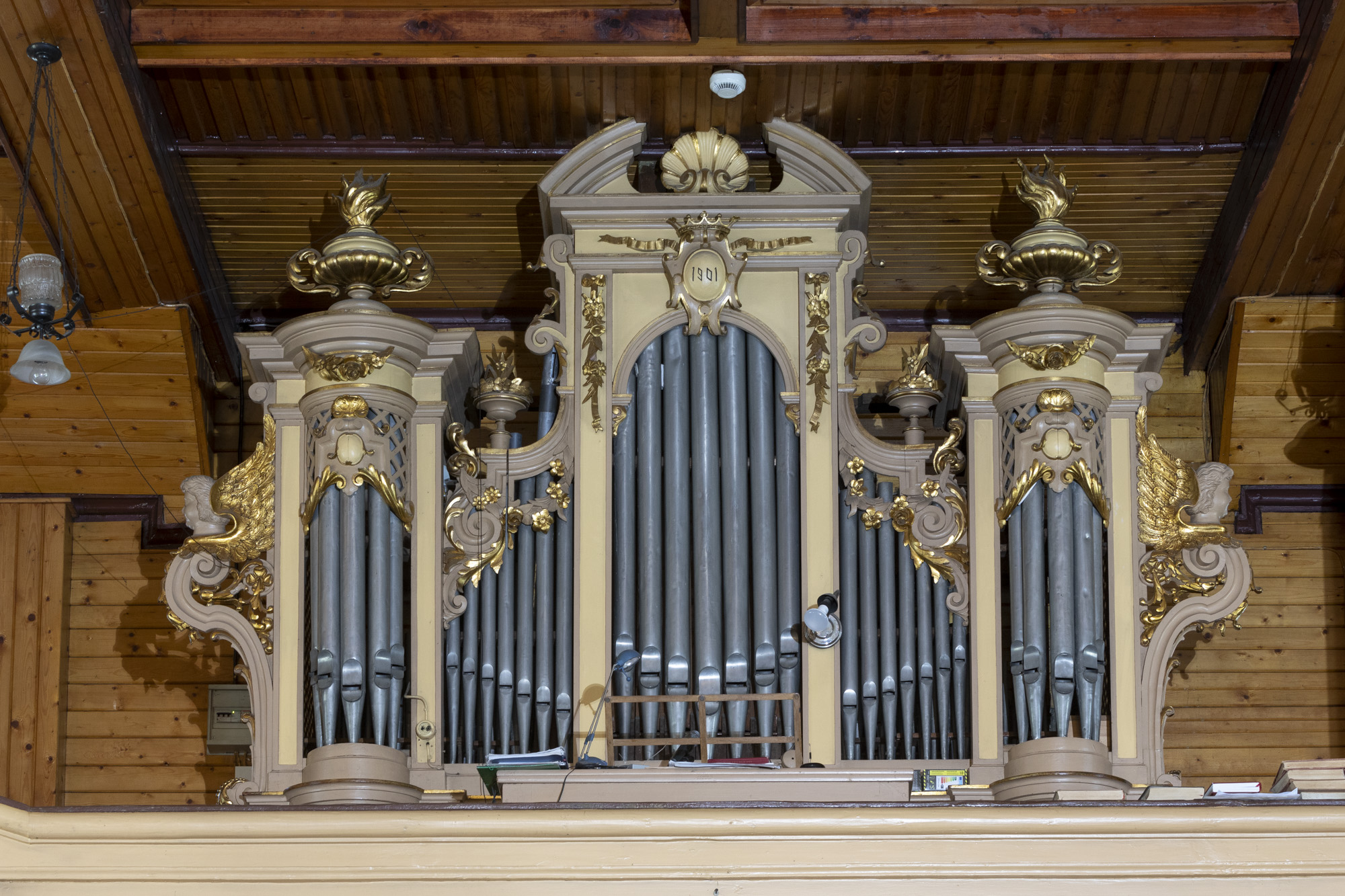 Instrument dęty, klawiszowy. Złożony z 31 piszczałek organowych i stroikowych wykonanych z metalu, w formie cylindrycznej. Piszczałki o różnej wielkości, zgrupowane w pięć zespołów ujętych w oddzielne obudowy. Napędzany mechanizmem powietrznym złożonym z miechów, zbiorników i wiatrownic - umieszczonych z tyłu i z boków instrumentu. Mechanizm klawiszowy o dwóch rejestrach. Prospekt organowy w trójdzielnej, osiowo skomponowanej obudowie architektonicznej. Dolna część dzielona płycinami, zwieńczona wydatnym załamanym gzymsem, występującym półkoliście na wysokości skrajnych przęseł. Nastawa złożona z ustawionej na osi - wyższej i szerszej części środkowej oraz dwóch niższych części skrajnych połączonych elementami o wykroju cęgowym. Część środkowa nastawy w którym na osi stylizowana muszla. Nad arkada w nadłuczu kartusz z koroną, z wypukłym tondem i datą 1901. Po bokach na płaszczyźnie lizen pionowe festony z ornamentem kwiatowym. Elementy skrajne prospektu analogiczne, z częścią środkową wysuniętą półkoliście do przodu, z gzymsowaniem dolnym i wieńczącym oraz gładkimi lizenami po bokach. W górnej, czołowej partii ażurowa kratka romboidalna, wić akantowa, motyw muszli i uskrzydlone główki anielskie. Nad całością znicz w formie wazonu, z puklowaniem na płaszczu dolnym i stylizowanymi płomieniami u góry. Po bokach części skrajnych ukazane z profila uskrzydlone głowy anielskie na żłobionych wspornikach o wykroju esowym. Łączniki z częścią środkową w formie ram o wykroju cęgowym, z wicią akantową i wazonami u góry. Elementy drewniane malowane olejno na kolor beżowy, detal i inne dekoracje złocone.