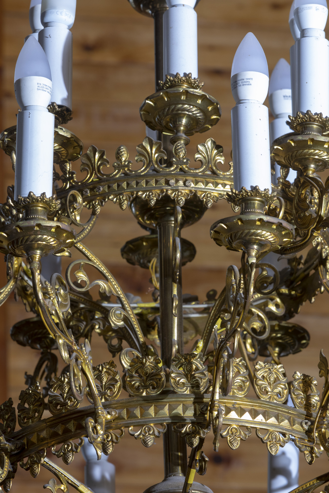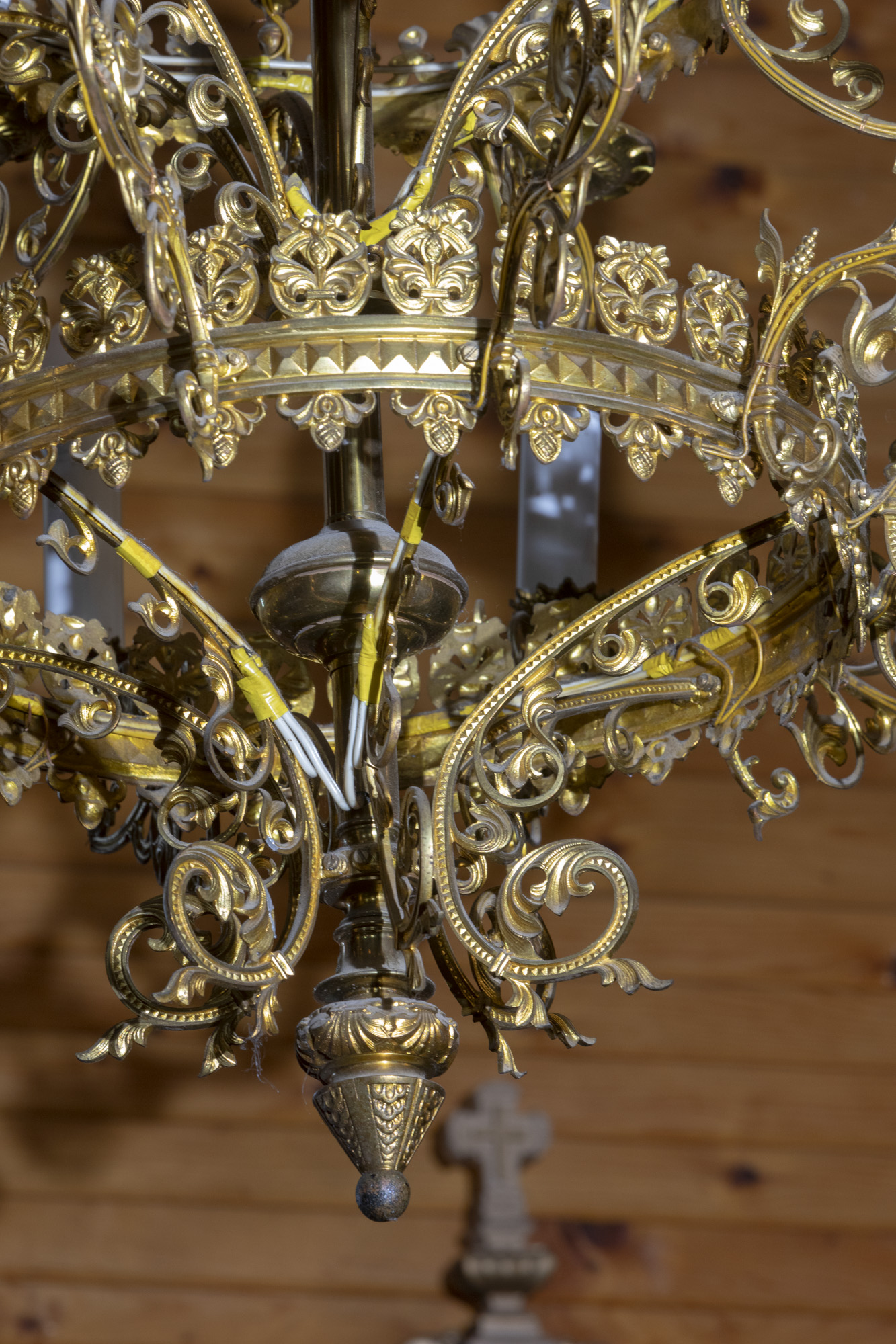 Żyrandol korpusowy, trójkondygnacyjny, eklektyczny. Trzon w formie tulei ujętej od dołu szyszką . Od trzonu odbiegają esowa to wygięte pędy akantowe, łącząc się u góry z koroną w formie ażurowej obręczy dekorowanej motywami palmety, rozet i ząbkowania w układach pasowych. Do korony przymocowanych dwanaście ramion o wykroju esowatym w oplocie z wici akantowej. Profitki talerzykowe, w nich tulejki w formie korony. Analogicznie pod względem formy i dekoracji opracowane dwie wyższe kondygnacje z dwunastoma i sześcioma ramionami dołączonymi do niższej, szerszej i węższej górnej obręczy . Zwieńczenie żyrandola koroną z pasem ząbkowania i pałkami o wykroju palmetowym. |