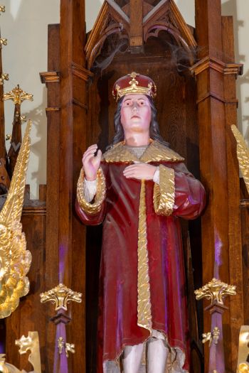 Po drugiej wojnie światowej wymieniono mensę ołtarzową dzięki funduszom przekazanym przez braci Tadeusza i Andrzeja Hałasów z Wysokiego. Obrazy w ołtarzu namalował W. Turewicz. Ołtarz drewniany, przyścienny, architektoniczny jednokondygnacjowy, pięcioosiowy ze zredukowaną mensą, swym kształtem nawiązujący do przekroju gotyckiego kościoła. Zasadniczą część ołtarza stanowi nastawa, na osi której płytka, zamknięta ostrołukową niszą z obrazem Matki Boskiej Częstochowskiej w szerokiej, złoconej ramie. Szczyt ramy wieńczy uskrzydlona głowa anielska. Ta część nastawy ujęta jest dwoma wiązkami kanelowych kolumn, zwieńczonych pinaklami z żabkami. Na zasuwiee umieszczony jest obraz świętego Michała Archanioła. Wnękę ołtarzową poprzedza tabernakulum ośmioboczne, ze ściankami artykułowanymi ostrołukowo zamkniętymi blendami, zwieńczony attyka z niewielkimi pinaklami z żabkami. Centralna część nastawy flankowana jest ostrołukowo zamkniętymi wnękami, w których ustawione są pełnopostacieowe rzeźby przedstawiające świętego Mikołaja i świętego Kazimierza, osadzone na cokołach. Zewnętrzne skraje wnęk podkreślone są czworobocznymi kolumnami, zwieńczonymi pinaklami z żabkami. Skrajne osie nastawy ołtarzowej wyznaczają drzwi, zamknięte ostrołukowymi szczytami, z kwiatonem na osi oraz krawędziami pokrytymi dekoracją w formie uschniętej wici roślinnej. W zwieńczeniu ołtarza rzeźba przedstawiająca świętego Kazimierza Królewicza, flankowana dwoma postaciami stojących aniołów z rozpostartymi skrzydłami. Wnęki, w których osadzone są rzeźby, zaakcentowane pinaklami z żabkami.