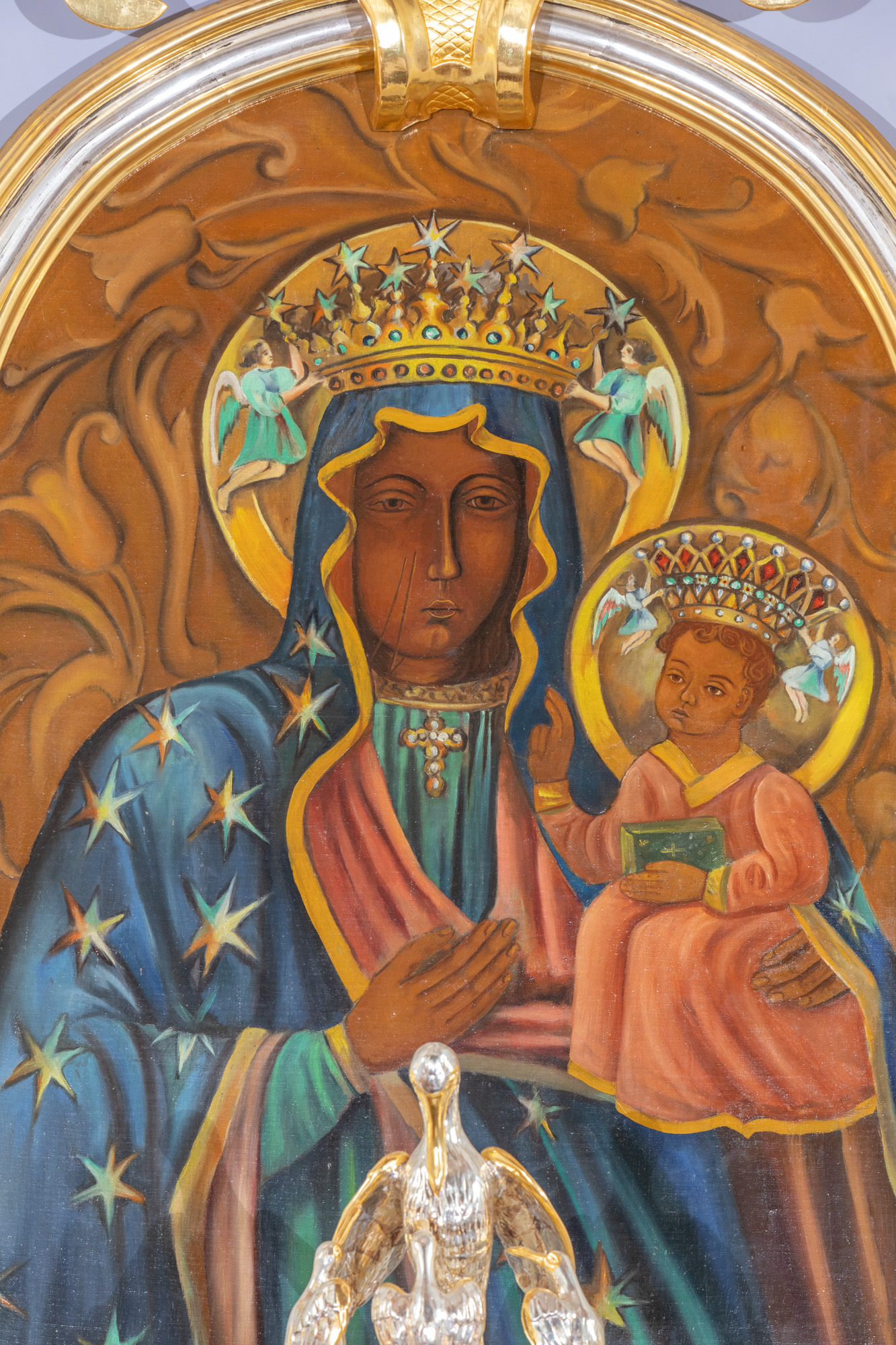 Obraz olejny na płótnie z kompozycją w prostokącie z półkolistym zamknięciem od góry. Przedstawienie w typie "Hodegetrii" Matka Boska z Dzieciątkiem w półpostaci, w ujęciu frontalnym. Twarz skierowana na wprost. Prawa ręka lekko podniesiona wskazuje Dzieciątko spoczywające na lewym przedramieniu. Twarze i ręce o ciemnej karnacji, modelunek linearny, schematyczny. Matka Boska w niebieskich szatach w gwieździste wzory z żółtą oblamówką. Dzieciątko w różowej sukni. Na głowach postaci korony podtrzymywane przez uskrzydlone aniołki, wokół koliste nimby. Tło brązowe, wzorzyste z motywem wici roślinnej.